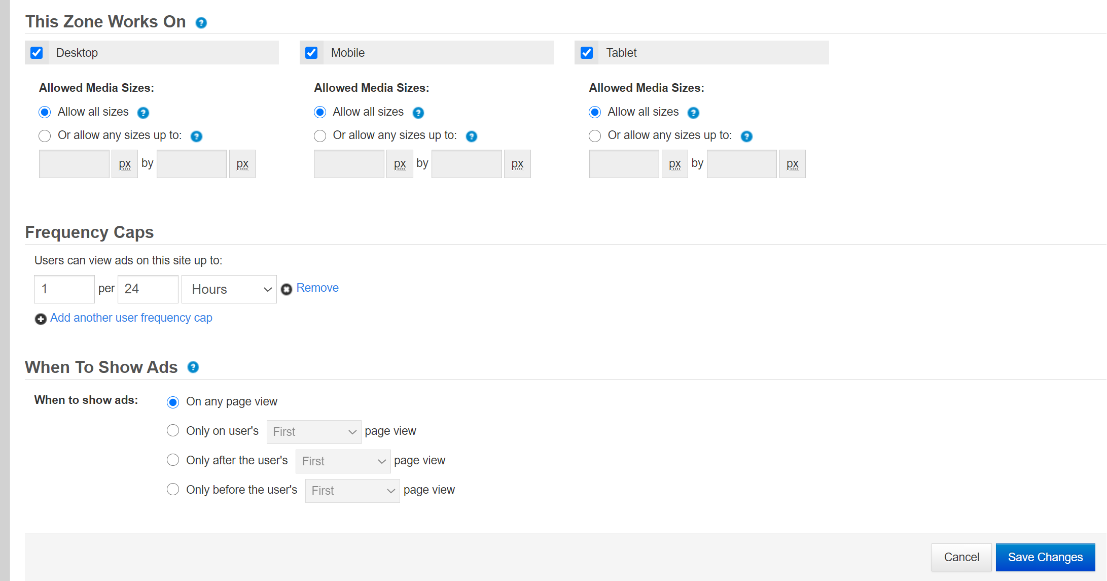 - The zone can be set up and displayed as you want, you can set up the CSS selectors and trigger/ not trigger the ad on certain selectors/ or decide on which page the ad should be displayed.